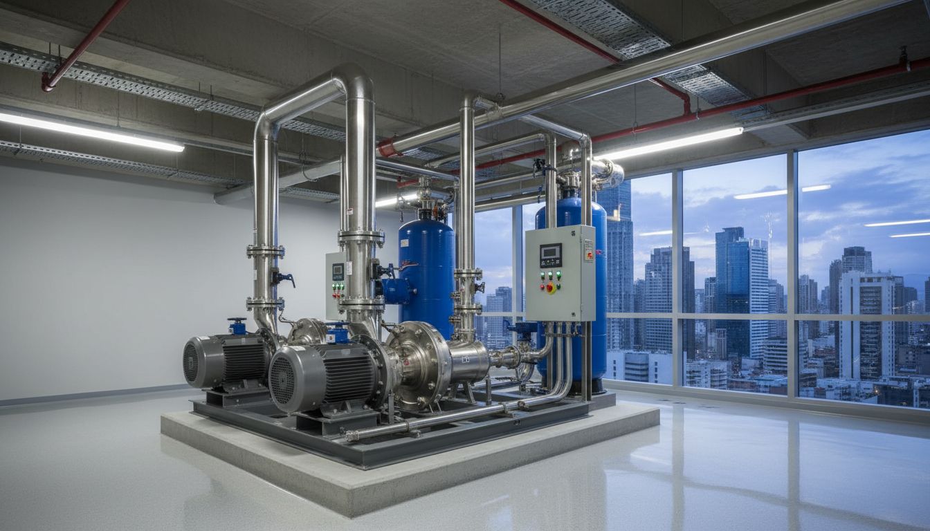 Los grupos a presión de agua son sistemas compuestos por una o varias bombas, un controlador y, a menudo, un vaso acumulador o tanque. Su función es mantener una presión estable en la red interior del edificio independientemente de la presión de la red pública.